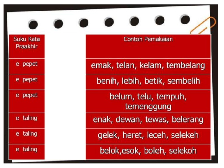 Original Posted By astrophel. Contoh pelafalan vokal e taling tertutup terdapat pada kata ekor enak dan seng. E pepet seolah-olah di buang atau ditiadakan dalam kaedah tulisan jawi.